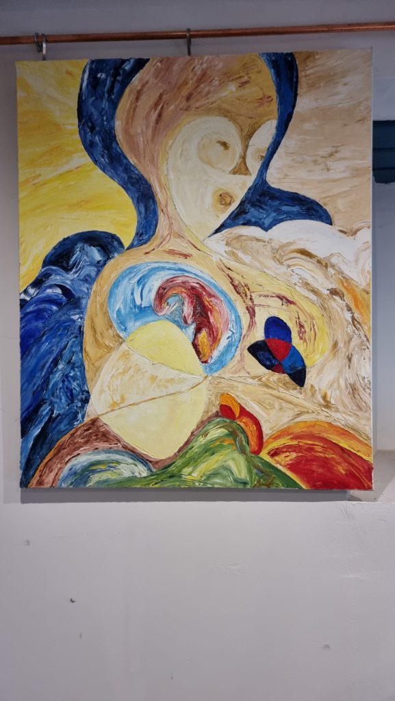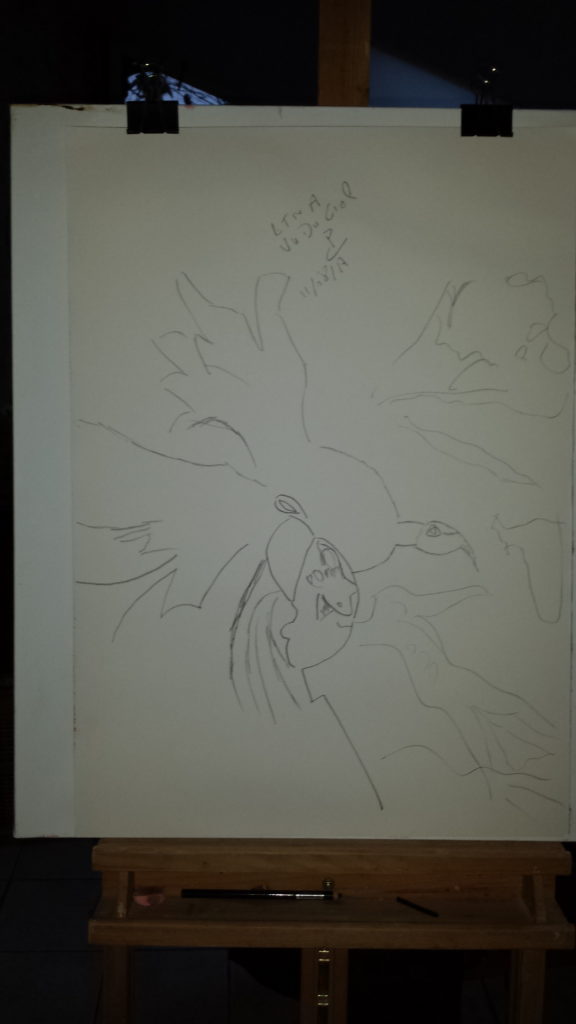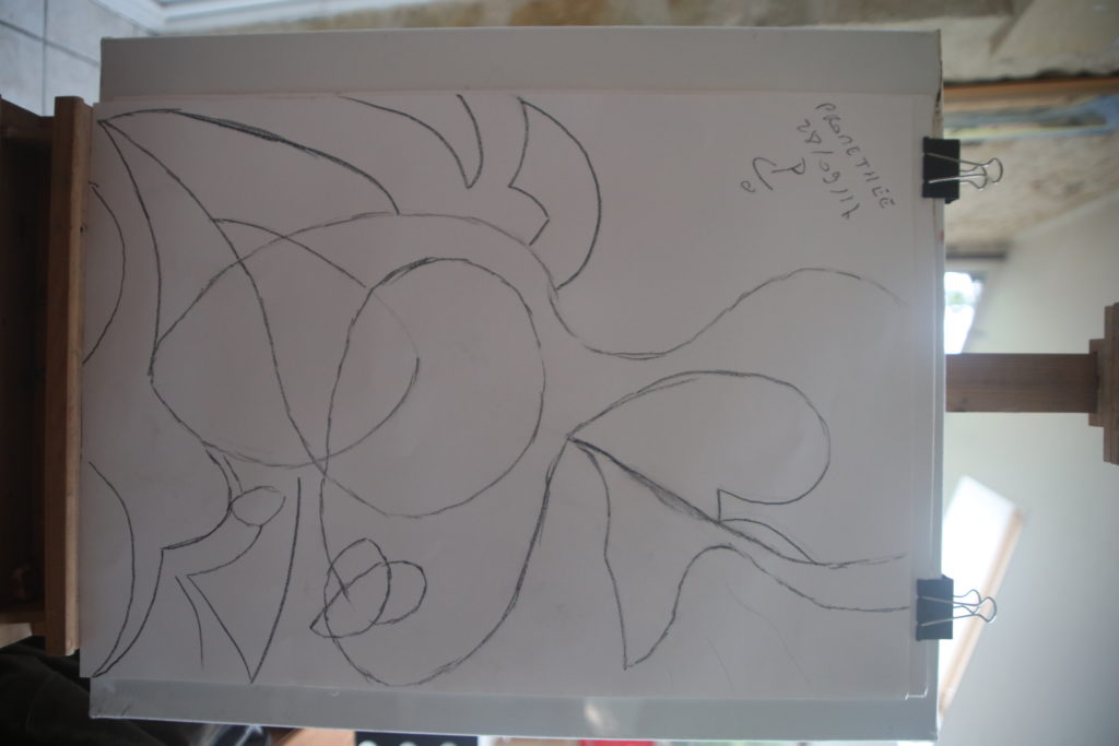 Un soir, une nuit devrais je dire, porté par un élan de rangement totalement irraisonné, je fais tomber un paquet d’esquisse et vois ce dernier essai à l’envers, me faisant penser dans l’instant à la grotte ayant abrité les premiers pas de Zeus sur le mont Ida, où mes pas se sont confondus avec ceux de ma compagne, parlant ensemble de naissance d’un TITAN et des difficultés de continuer à vivre pour un tel petit être : ce qui me relance dans la volonté d’aller au bout de ce rêve :