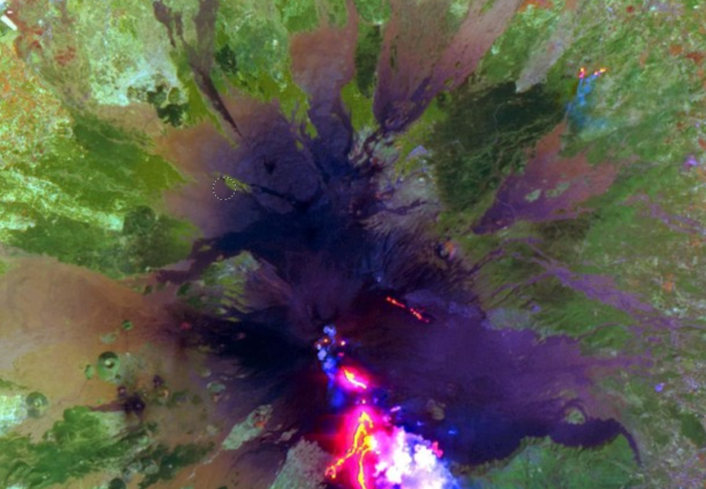 Le contexte est étrange : je travaillais sur des phénomènes de suivi de pratiques culturales en m’appuyant sur des photos satellitaires prises sur des longueurs d’ondes allant du non visible au non visible en passant par ce dernier … et je tombais sur une photo satellitaire, glissée (malicieusement ?) par erreur dans nos cartons, qui concernait une éruption de l’Etna :