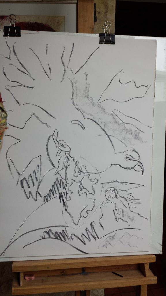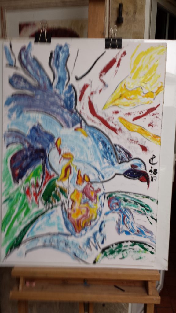 L’image de l’oiseau Phœnix, ayant hanté mon enfance (je le cherchais assidument par la fenêtre dans la salle de classe de ma petite école), m’a immédiatement frappé, pour une fois je l’observais d’en haut, et pas d’en dessous, ce nuage si évocateur, ce tableau onirique emprunt de réalité se transformant peu à peu d’esquisses en esquisses en: